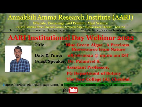 Title: “Blue Green Algae - A Precious Bioresource from Nature” Speaker: Dr. Palanivel S, Assistant Professor, PG Department of Botany, The New College (Autonomous), Chennai, Tamil Nadu India. Date: 08/06/2022 Time: 09:00 -10:00 IST _________ Kindly join YouTube Channel to join the session. Kindly join the Telegram Channel for further updates and webinar joining links https://t.me/aari_bioscience The Webinar will be live-streamed on YouTube. Watch the session live on YouTube Channel "E Teaching Tamil" www.youtube.com/c/eteachingtamil Subscribe above Youtube channel to attend the Program... Candidates who attend the entire session only will get the certificate... Attendance and Feedback forms will be given during the session, filling both the forms are mandatory to get a certificate. for more information